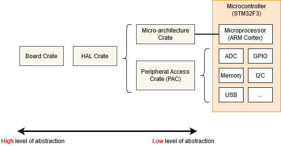 A Board Support Crate provides a high level interface configured for a specific board. It usually depends on a HAL crate. There is a more detailed description on the memory-mapped registers page or for a broader overview see this video.
